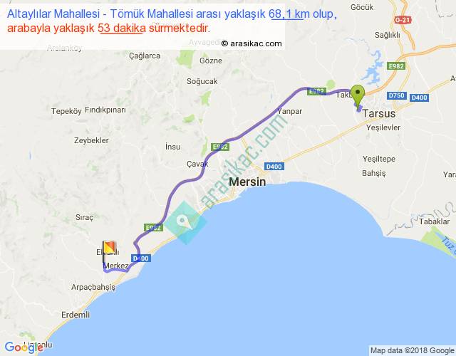 Altaylılar Mahallesi - Tömük Mahallesi arası yaklaşık olarak 90 km/h ile yukarıda belirtilen sürede olup, iki yerin kuş uçuşu uzaklığı (mesafesi) 51'dir. Yolculuk otobüsle 1 saat 8 dakika sürmektedir.