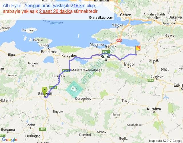 Altı Eylül - Yenigün arası yaklaşık olarak 90 km/h ile yukarıda belirtilen sürede olup, iki yerin kuş uçuşu uzaklığı (mesafesi) 164'dir. Yolculuk otobüsle 3 saat 9 dakika sürmektedir.