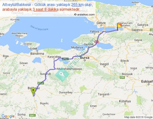 Altıeylül Balıkesir - Gölcük arası yaklaşık olarak 90 km/h ile yukarıda belirtilen sürede olup, iki yerin kuş uçuşu uzaklığı (mesafesi) 208'dir. Yolculuk otobüsle 4 saat 4 dakika sürmektedir.
