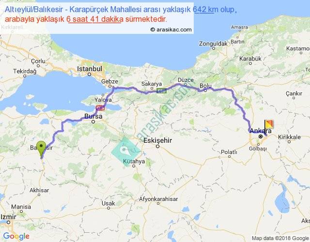 Altıeylül Balıkesir - Karapürçek Mahallesi arası yaklaşık olarak 90 km/h ile yukarıda belirtilen sürede olup, iki yerin kuş uçuşu uzaklığı (mesafesi) 435'dir. Eğer belirtilen yerler arasında uçak seferi var ise bu süre uçakla 40 dakika'ya kadar düşebilir. Yolculuk otobüsle 8 saat 41 dakika sürmektedir.