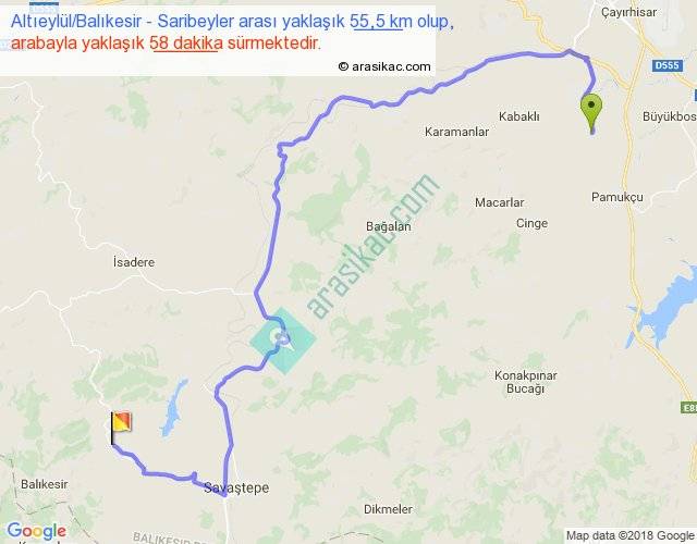Altıeylül Balıkesir - Saribeyler arası yaklaşık olarak 90 km/h ile yukarıda belirtilen sürede olup, iki yerin kuş uçuşu uzaklığı (mesafesi) 31'dir. Yolculuk otobüsle 1 saat 15 dakika sürmektedir.