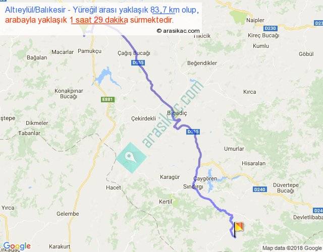 Altıeylül Balıkesir - Yüreğil arası yaklaşık olarak 90 km/h ile yukarıda belirtilen sürede olup, iki yerin kuş uçuşu uzaklığı (mesafesi) 59'dir. Yolculuk otobüsle 1 saat 55 dakika sürmektedir.