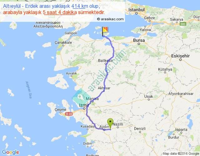 Altıeylül - Erdek arası yaklaşık olarak 90 km/h ile yukarıda belirtilen sürede olup, iki yerin kuş uçuşu uzaklığı (mesafesi) 283'dir. Eğer belirtilen yerler arasında uçak seferi var ise bu süre uçakla 26 dakika'ya kadar düşebilir. Yolculuk otobüsle 6 saat 35 dakika sürmektedir.