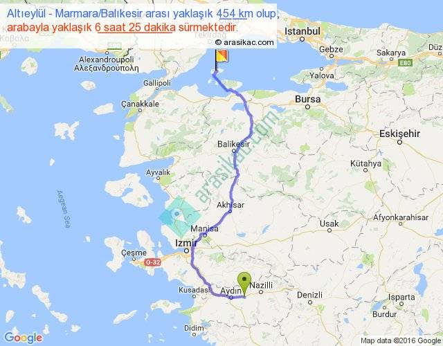 Altıeylül - Marmara Balıkesir arası yaklaşık olarak 90 km/h ile yukarıda belirtilen sürede olup, iki yerin kuş uçuşu uzaklığı (mesafesi) 310'dir. Eğer belirtilen yerler arasında uçak seferi var ise bu süre uçakla 28 dakika'ya kadar düşebilir. Yolculuk otobüsle 8 saat 20 dakika sürmektedir.