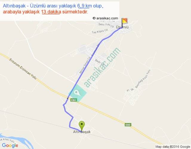 Altınbaşak - Üzümlü arası yaklaşık olarak 90 km/h ile yukarıda belirtilen sürede olup, iki yerin kuş uçuşu uzaklığı (mesafesi) 5'dir. Yolculuk otobüsle 16 dakika sürmektedir.