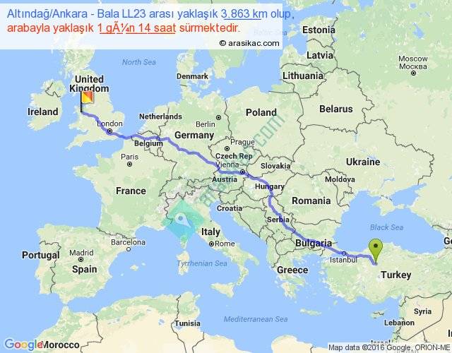 Altındağ Ankara - Bala LL23 arası yaklaşık olarak 90 km/h ile yukarıda belirtilen sürede olup, iki yerin kuş uçuşu uzaklığı (mesafesi) 3084'dir. Eğer belirtilen yerler arasında uçak seferi var ise bu süre uçakla 4 saat 44 dakika'ya kadar düşebilir. Yolculuk otobüsle 2 gün 1 saat sürmektedir.
