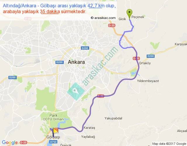 Altındağ Ankara - Gölbaşı arası yaklaşık olarak 90 km/h ile yukarıda belirtilen sürede olup, iki yerin kuş uçuşu uzaklığı (mesafesi) 470'dir. Eğer belirtilen yerler arasında uçak seferi var ise bu süre uçakla 43 dakika'ya kadar düşebilir. Yolculuk otobüsle 10 saat 12 dakika sürmektedir.