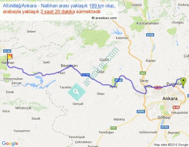 Altındağ Ankara - Nallıhan arası yaklaşık olarak 90 km/h ile yukarıda belirtilen sürede olup, iki yerin kuş uçuşu uzaklığı (mesafesi) 140'dir. Yolculuk otobüsle 3 saat 2 dakika sürmektedir.