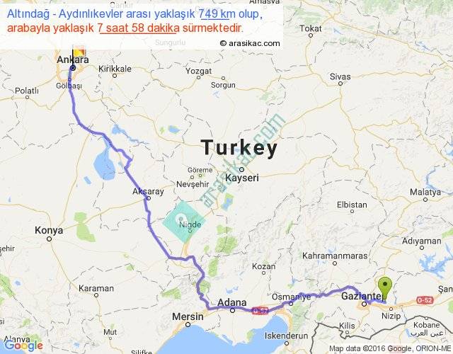 Altındağ - Aydınlıkevler arası yaklaşık olarak 90 km/h ile yukarıda belirtilen sürede olup, iki yerin kuş uçuşu uzaklığı (mesafesi) 524'dir. Eğer belirtilen yerler arasında uçak seferi var ise bu süre uçakla 48 dakika'ya kadar düşebilir. Yolculuk otobüsle 10 saat 21 dakika sürmektedir.