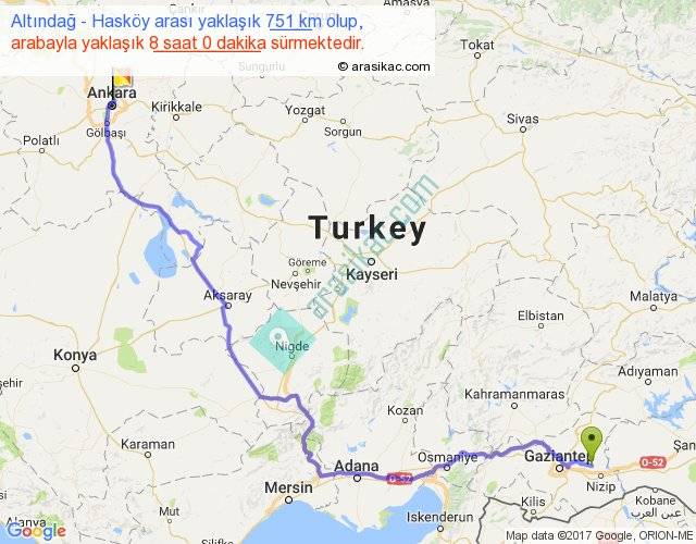 Altındağ - Hasköy arası yaklaşık olarak 90 km/h ile yukarıda belirtilen sürede olup, iki yerin kuş uçuşu uzaklığı (mesafesi) 525'dir. Eğer belirtilen yerler arasında uçak seferi var ise bu süre uçakla 48 dakika'ya kadar düşebilir. Yolculuk otobüsle 10 saat 24 dakika sürmektedir.