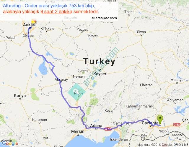 Altındağ - Önder arası yaklaşık olarak 90 km/h ile yukarıda belirtilen sürede olup, iki yerin kuş uçuşu uzaklığı (mesafesi) 521'dir. Eğer belirtilen yerler arasında uçak seferi var ise bu süre uçakla 48 dakika'ya kadar düşebilir. Yolculuk otobüsle 10 saat 26 dakika sürmektedir.