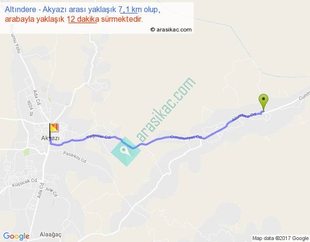 Altındere - Akyazı arası yaklaşık olarak 90 km/h ile yukarıda belirtilen sürede olup, iki yerin kuş uçuşu uzaklığı (mesafesi) 6'dir. Yolculuk otobüsle 15 dakika sürmektedir.