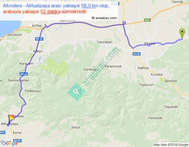 Altındere - Alifuatpaşa arası yaklaşık olarak 90 km/h ile yukarıda belirtilen sürede olup, iki yerin kuş uçuşu uzaklığı (mesafesi) 38'dir. Yolculuk otobüsle 1 saat 7 dakika sürmektedir.