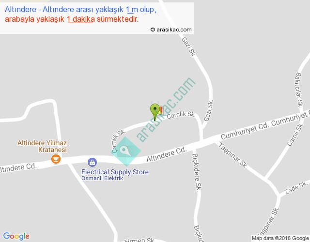 Altındere - Altındere arası yaklaşık olarak 90 km/h ile yukarıda belirtilen sürede olup, iki yerin kuş uçuşu uzaklığı (mesafesi) 0'dir. Yolculuk otobüsle 1 dakika sürmektedir.