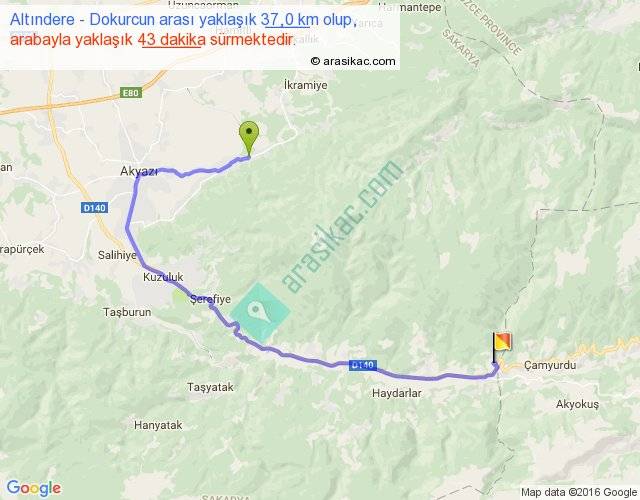 Altındere - Dokurcun arası yaklaşık olarak 90 km/h ile yukarıda belirtilen sürede olup, iki yerin kuş uçuşu uzaklığı (mesafesi) 19'dir. Yolculuk otobüsle 55 dakika sürmektedir.