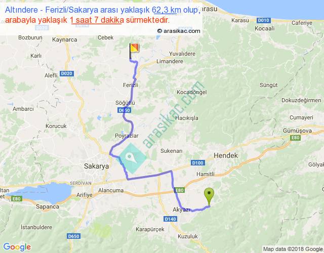 Altındere - Ferizli Sakarya arası yaklaşık olarak 90 km/h ile yukarıda belirtilen sürede olup, iki yerin kuş uçuşu uzaklığı (mesafesi) 38'dir. Yolculuk otobüsle 1 saat 27 dakika sürmektedir.