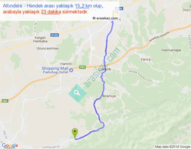 Altındere - Hendek arası yaklaşık olarak 90 km/h ile yukarıda belirtilen sürede olup, iki yerin kuş uçuşu uzaklığı (mesafesi) 12'dir. Yolculuk otobüsle 29 dakika sürmektedir.