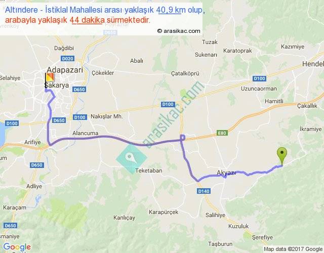 Altındere - İstiklal Mahallesi arası yaklaşık olarak 90 km/h ile yukarıda belirtilen sürede olup, iki yerin kuş uçuşu uzaklığı (mesafesi) 28'dir. Yolculuk otobüsle 57 dakika sürmektedir.