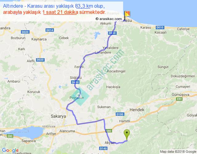 Altındere - Karasu arası yaklaşık olarak 90 km/h ile yukarıda belirtilen sürede olup, iki yerin kuş uçuşu uzaklığı (mesafesi) 45'dir. Yolculuk otobüsle 1 saat 45 dakika sürmektedir.