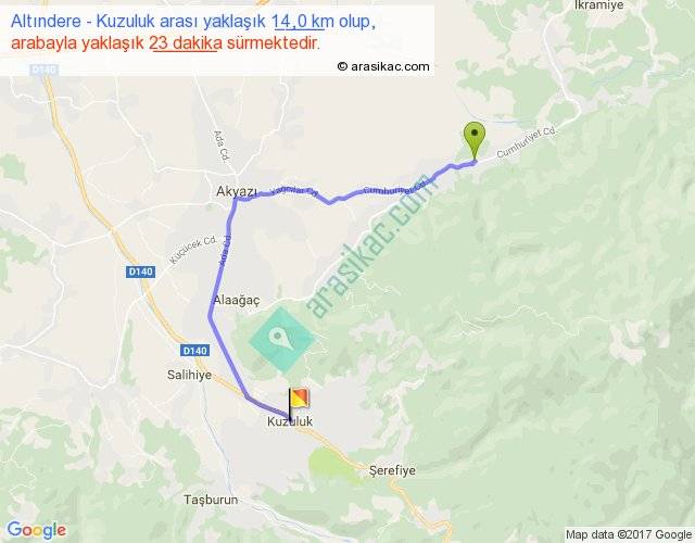 Altındere - Kuzuluk arası yaklaşık olarak 90 km/h ile yukarıda belirtilen sürede olup, iki yerin kuş uçuşu uzaklığı (mesafesi) 8'dir. Yolculuk otobüsle 29 dakika sürmektedir.