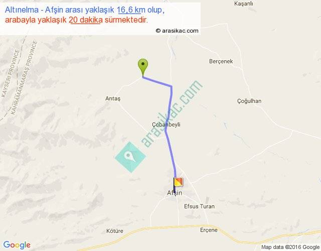 Altınelma - Afşin arası yaklaşık olarak 90 km/h ile yukarıda belirtilen sürede olup, iki yerin kuş uçuşu uzaklığı (mesafesi) 14'dir. Yolculuk otobüsle 26 dakika sürmektedir.