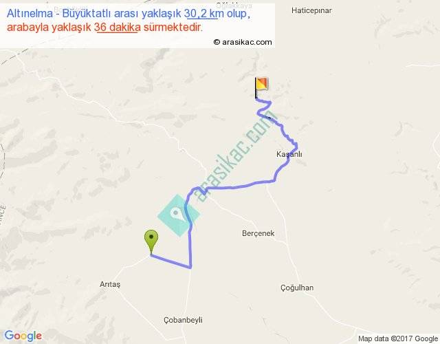Altınelma - Büyüktatlı arası yaklaşık olarak 90 km/h ile yukarıda belirtilen sürede olup, iki yerin kuş uçuşu uzaklığı (mesafesi) 16'dir. Yolculuk otobüsle 46 dakika sürmektedir.