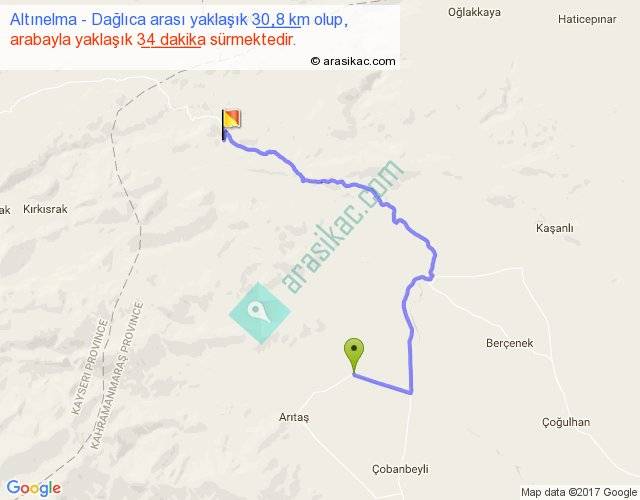 Altınelma - Dağlıca arası yaklaşık olarak 90 km/h ile yukarıda belirtilen sürede olup, iki yerin kuş uçuşu uzaklığı (mesafesi) 16'dir. Yolculuk otobüsle 44 dakika sürmektedir.