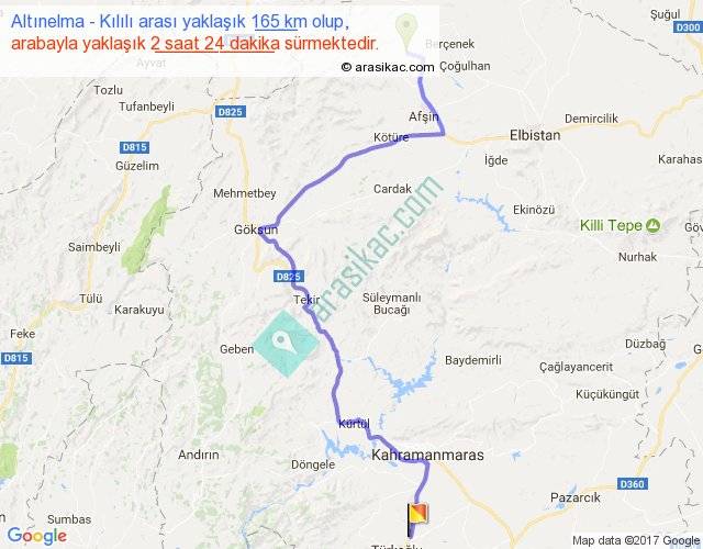 Altınelma - Kılılı arası yaklaşık olarak 90 km/h ile yukarıda belirtilen sürede olup, iki yerin kuş uçuşu uzaklığı (mesafesi) 106'dir. Yolculuk otobüsle 3 saat 7 dakika sürmektedir.