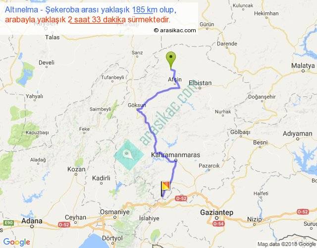 Altınelma - Şekeroba arası yaklaşık olarak 90 km/h ile yukarıda belirtilen sürede olup, iki yerin kuş uçuşu uzaklığı (mesafesi) 123'dir. Yolculuk otobüsle 3 saat 18 dakika sürmektedir.