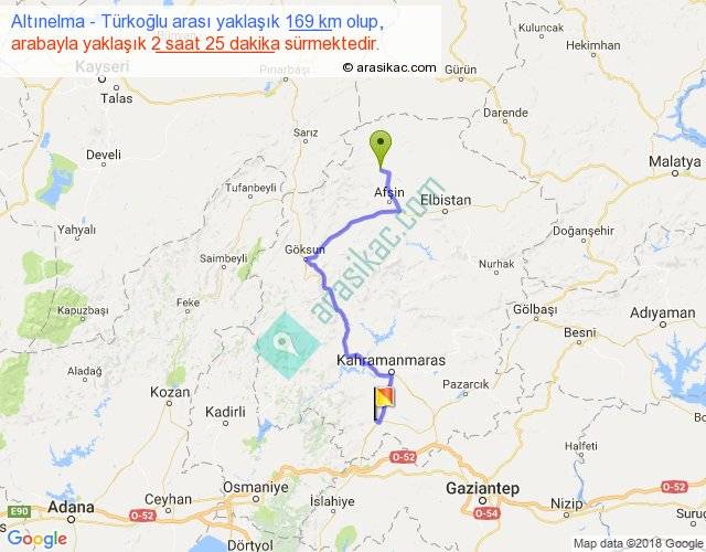 Altınelma - Türkoğlu arası yaklaşık olarak 90 km/h ile yukarıda belirtilen sürede olup, iki yerin kuş uçuşu uzaklığı (mesafesi) 109'dir. Yolculuk otobüsle 3 saat 8 dakika sürmektedir.