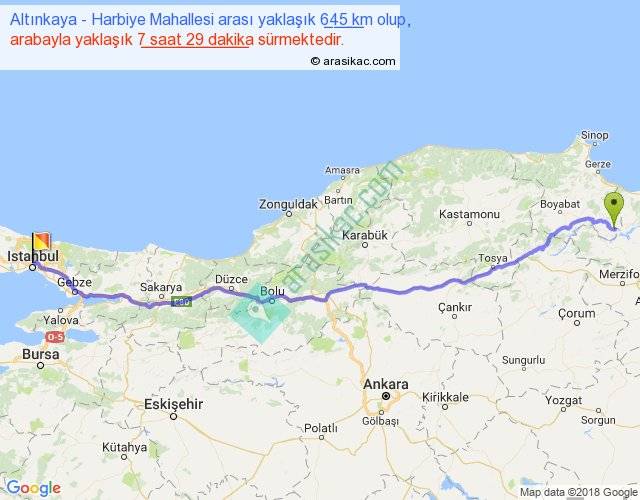 Altınkaya - Harbiye Mahallesi arası yaklaşık olarak 90 km/h ile yukarıda belirtilen sürede olup, iki yerin kuş uçuşu uzaklığı (mesafesi) 531'dir. Eğer belirtilen yerler arasında uçak seferi var ise bu süre uçakla 49 dakika'ya kadar düşebilir. Yolculuk otobüsle 9 saat 43 dakika sürmektedir.