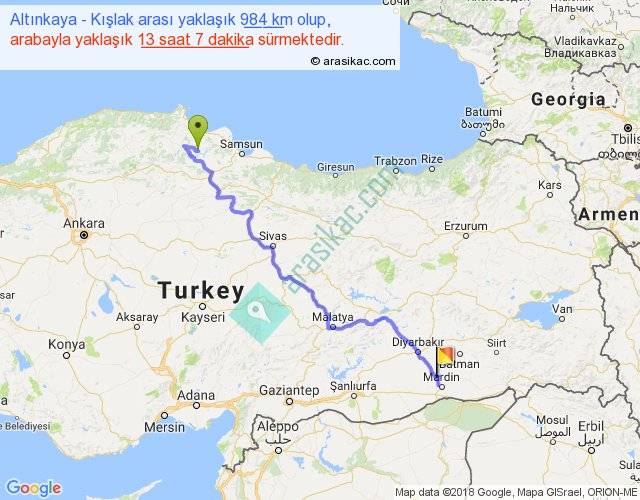 Altınkaya - Kışlak arası yaklaşık olarak 90 km/h ile yukarıda belirtilen sürede olup, iki yerin kuş uçuşu uzaklığı (mesafesi) 618'dir. Eğer belirtilen yerler arasında uçak seferi var ise bu süre uçakla 57 dakika'ya kadar düşebilir. Yolculuk otobüsle 17 saat 3 dakika sürmektedir.