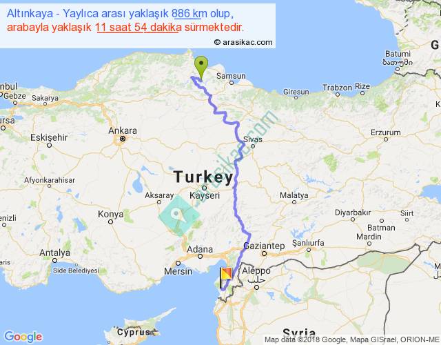 Altınkaya - Yaylıca arası yaklaşık olarak 90 km/h ile yukarıda belirtilen sürede olup, iki yerin kuş uçuşu uzaklığı (mesafesi) 573'dir. Eğer belirtilen yerler arasında uçak seferi var ise bu süre uçakla 52 dakika'ya kadar düşebilir. Yolculuk otobüsle 15 saat 28 dakika sürmektedir.