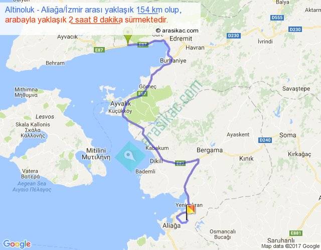 Altinoluk - Aliağa İzmir arası yaklaşık olarak 90 km/h ile yukarıda belirtilen sürede olup, iki yerin kuş uçuşu uzaklığı (mesafesi) 87'dir. Yolculuk otobüsle 2 saat 46 dakika sürmektedir.