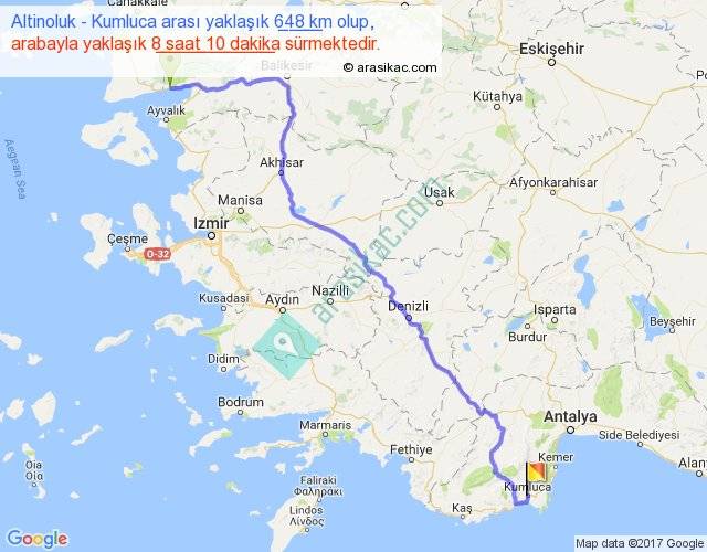 Altinoluk - Kumluca arası yaklaşık olarak 90 km/h ile yukarıda belirtilen sürede olup, iki yerin kuş uçuşu uzaklığı (mesafesi) 470'dir. Eğer belirtilen yerler arasında uçak seferi var ise bu süre uçakla 43 dakika'ya kadar düşebilir. Yolculuk otobüsle 10 saat 37 dakika sürmektedir.