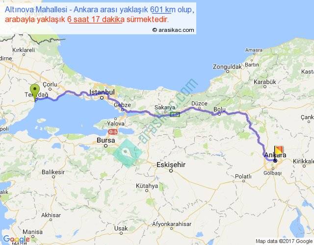 Altınova Mahallesi - Ankara arası yaklaşık olarak 90 km/h ile yukarıda belirtilen sürede olup, iki yerin kuş uçuşu uzaklığı (mesafesi) 466'dir. Eğer belirtilen yerler arasında uçak seferi var ise bu süre uçakla 43 dakika'ya kadar düşebilir. Yolculuk otobüsle 8 saat 10 dakika sürmektedir.