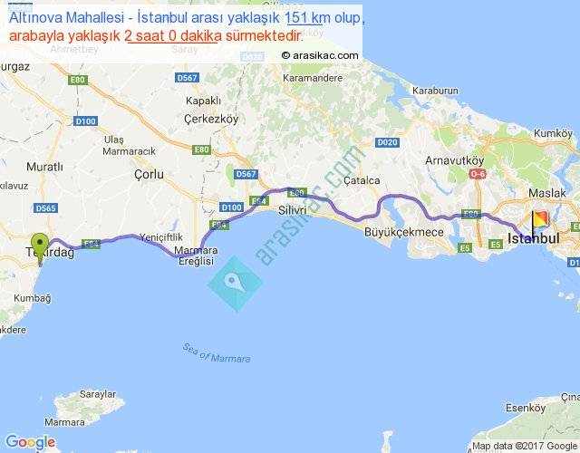 Altınova Mahallesi - İstanbul arası yaklaşık olarak 90 km/h ile yukarıda belirtilen sürede olup, iki yerin kuş uçuşu uzaklığı (mesafesi) 125'dir. Yolculuk otobüsle 2 saat 36 dakika sürmektedir.