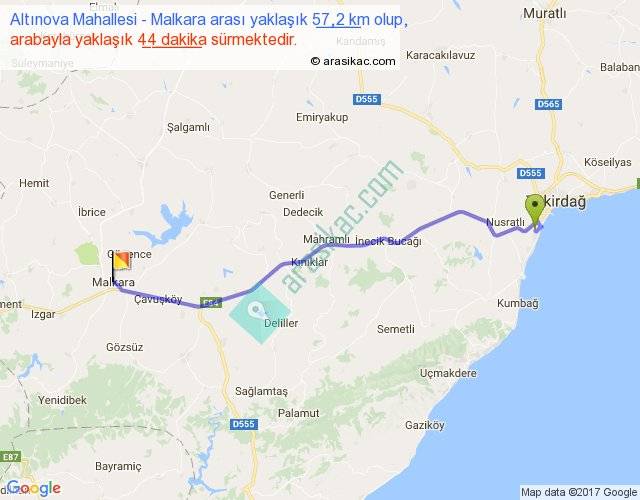 Altınova Mahallesi - Malkara arası yaklaşık olarak 90 km/h ile yukarıda belirtilen sürede olup, iki yerin kuş uçuşu uzaklığı (mesafesi) 49'dir. Yolculuk otobüsle 57 dakika sürmektedir.