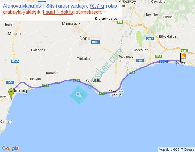 Altınova Mahallesi - Silivri arası yaklaşık olarak 90 km/h ile yukarıda belirtilen sürede olup, iki yerin kuş uçuşu uzaklığı (mesafesi) 65'dir. Yolculuk otobüsle 1 saat 19 dakika sürmektedir.