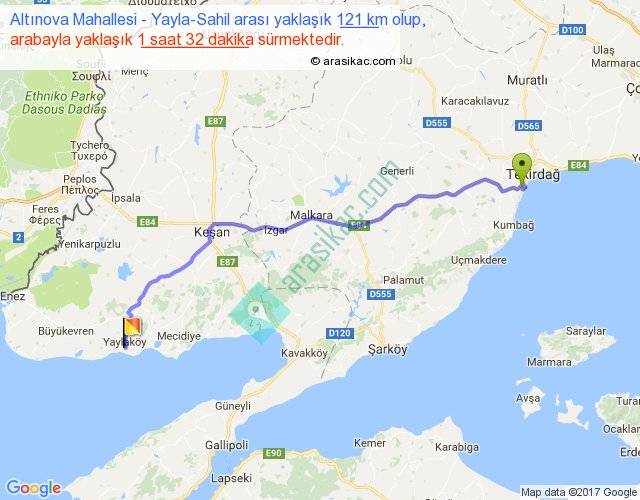 Altınova Mahallesi - Yayla-Sahil arası yaklaşık olarak 90 km/h ile yukarıda belirtilen sürede olup, iki yerin kuş uçuşu uzaklığı (mesafesi) 98'dir. Yolculuk otobüsle 1 saat 59 dakika sürmektedir.