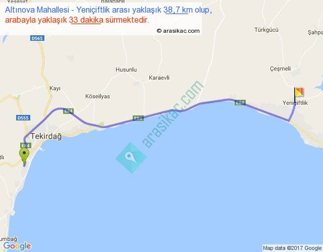 Altınova Mahallesi - Yeniçiftlik arası yaklaşık olarak 90 km/h ile yukarıda belirtilen sürede olup, iki yerin kuş uçuşu uzaklığı (mesafesi) 32'dir. Yolculuk otobüsle 42 dakika sürmektedir.