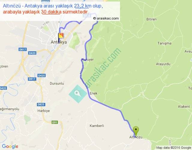 Altınözü - Antakya arası yaklaşık olarak 90 km/h ile yukarıda belirtilen sürede olup, iki yerin kuş uçuşu uzaklığı (mesafesi) 13'dir. Yolculuk otobüsle 39 dakika sürmektedir.