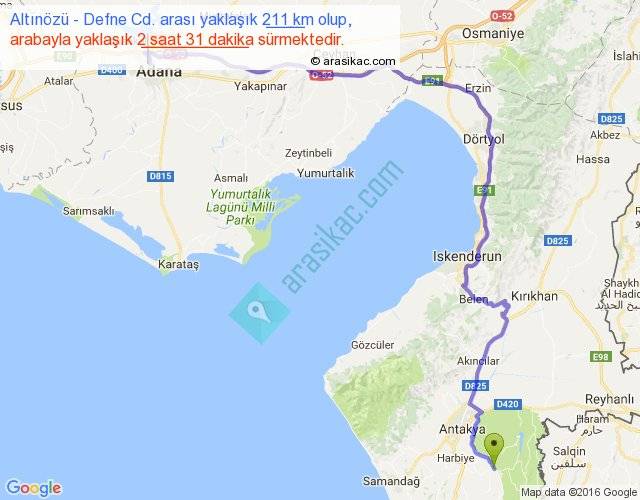 Altınözü - Defne Cd. arası yaklaşık olarak 90 km/h ile yukarıda belirtilen sürede olup, iki yerin kuş uçuşu uzaklığı (mesafesi) 130'dir. Yolculuk otobüsle 3 saat 16 dakika sürmektedir.
