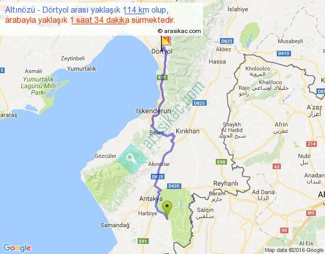 Altınözü - Dörtyol arası yaklaşık olarak 90 km/h ile yukarıda belirtilen sürede olup, iki yerin kuş uçuşu uzaklığı (mesafesi) 81'dir. Yolculuk otobüsle 2 saat 2 dakika sürmektedir.