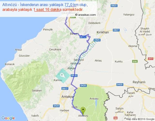 Altınözü - İskenderun arası yaklaşık olarak 90 km/h ile yukarıda belirtilen sürede olup, iki yerin kuş uçuşu uzaklığı (mesafesi) 52'dir. Yolculuk otobüsle 1 saat 38 dakika sürmektedir.
