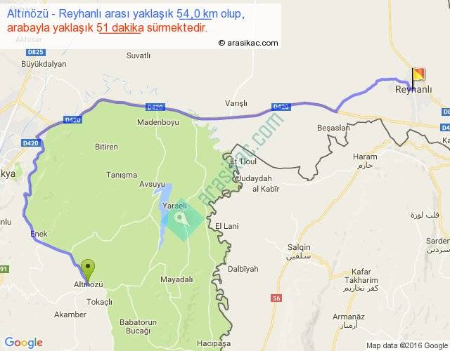 Altınözü - Reyhanlı arası yaklaşık olarak 90 km/h ile yukarıda belirtilen sürede olup, iki yerin kuş uçuşu uzaklığı (mesafesi) 33'dir. Yolculuk otobüsle 1 saat 6 dakika sürmektedir.