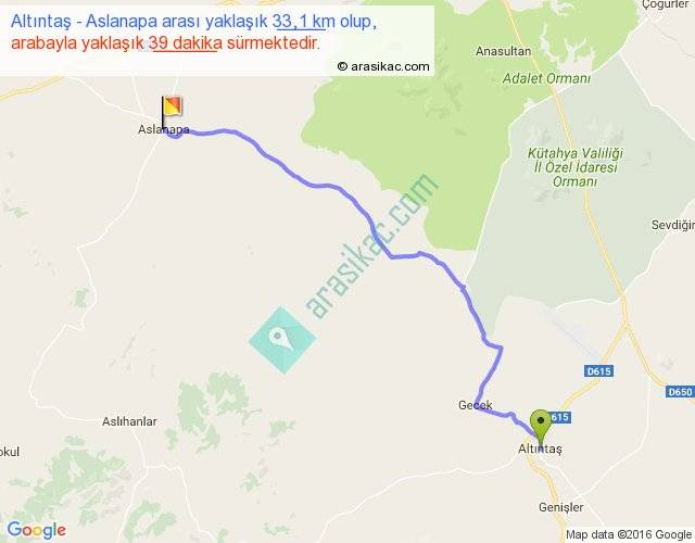 Altıntaş - Aslanapa arası yaklaşık olarak 90 km/h ile yukarıda belirtilen sürede olup, iki yerin kuş uçuşu uzaklığı (mesafesi) 27'dir. Yolculuk otobüsle 50 dakika sürmektedir.