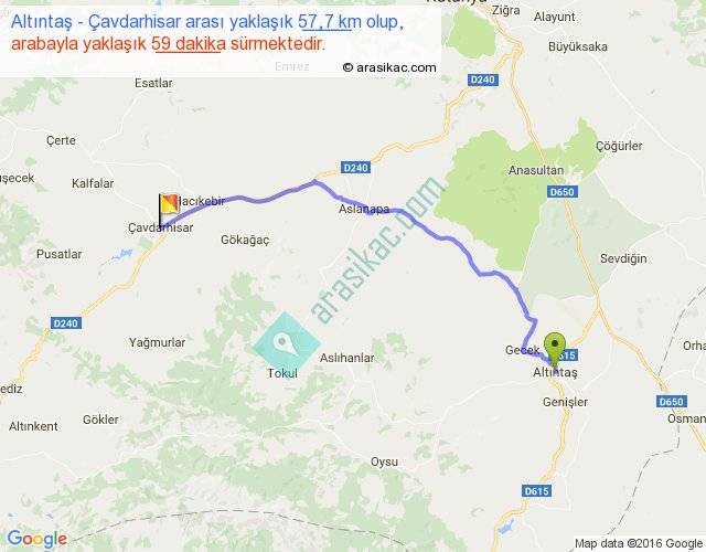 Altıntaş - Çavdarhisar arası yaklaşık olarak 90 km/h ile yukarıda belirtilen sürede olup, iki yerin kuş uçuşu uzaklığı (mesafesi) 45'dir. Yolculuk otobüsle 1 saat 16 dakika sürmektedir.