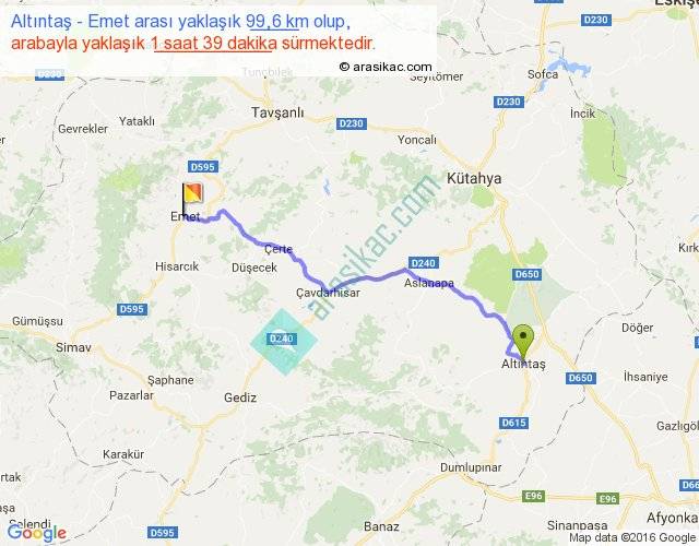 Altıntaş - Emet arası yaklaşık olarak 90 km/h ile yukarıda belirtilen sürede olup, iki yerin kuş uçuşu uzaklığı (mesafesi) 79'dir. Yolculuk otobüsle 2 saat 8 dakika sürmektedir.