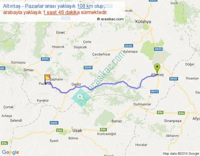 Altıntaş - Pazarlar arası yaklaşık olarak 90 km/h ile yukarıda belirtilen sürede olup, iki yerin kuş uçuşu uzaklığı (mesafesi) 85'dir. Yolculuk otobüsle 2 saat 17 dakika sürmektedir.